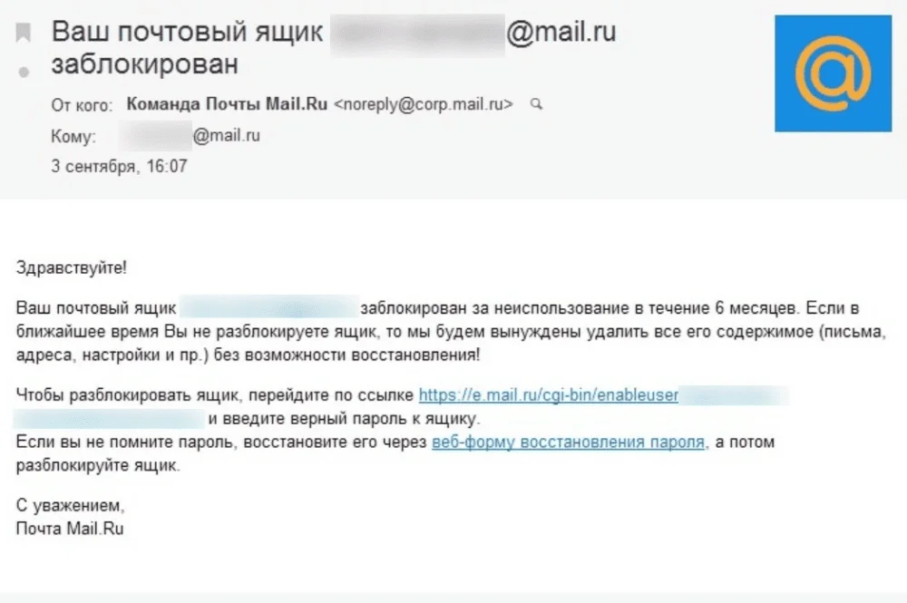 Почта Mail. Здесь есть два сценария. Если пользователь сам «отказался от использования» (запустил процедуру закрытия), он может возобновить доступ к своему имени в течение 5 лет, но старые письма при этом не сохранятся. Если же ящик был окончательно удалён или заблокирован сервисом за нарушения, восстановить его не получится. Как и у других провайдеров, повторная регистрация почты с аналогичным уникальным именем в системе Mail не предусмотрена.