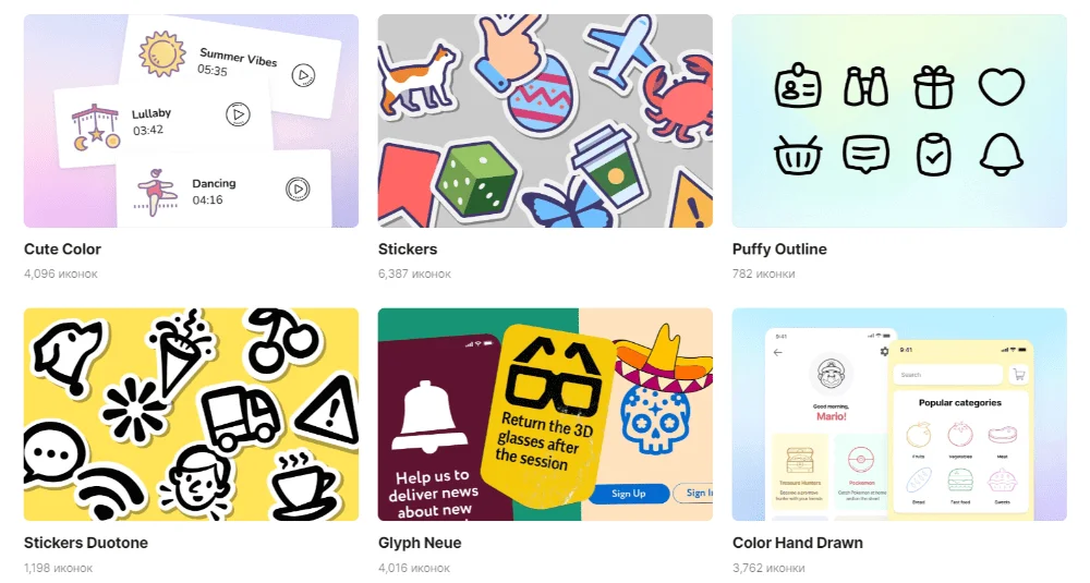 Сервис создает энциклопедию иконок в разных стилях с 2012 года, которая пополняется на сайте и в плагине для Figma. Дизайнеры уделяют особое внимание формам и сглаживанию линий, а также продумывают дальнейшее использование картинок в коммерческих проектах.