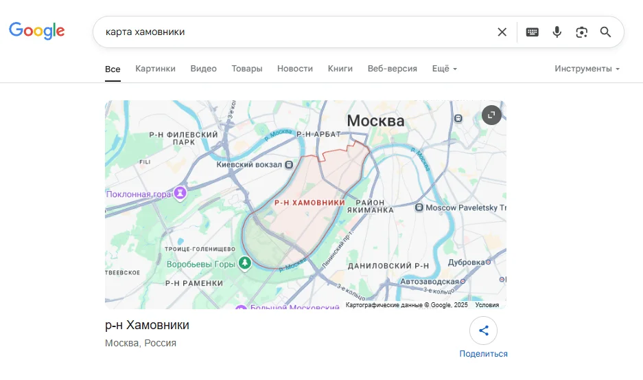 Поиск по Google Maps. В выдаче показывается карта. Если ввести просто район, он будет выделен на карте, если адрес ― то карта вообще не отобразится.