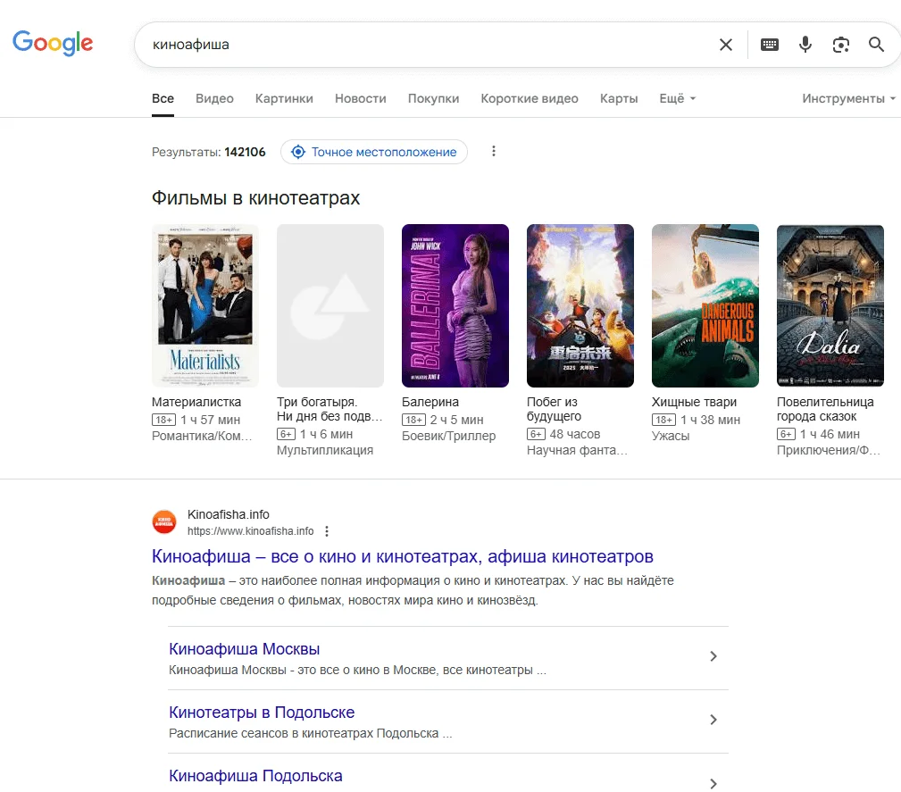 Если не уточнять запрос и ввести просто «киноафиша», в расписание попадут кинотеатры из вашего города.