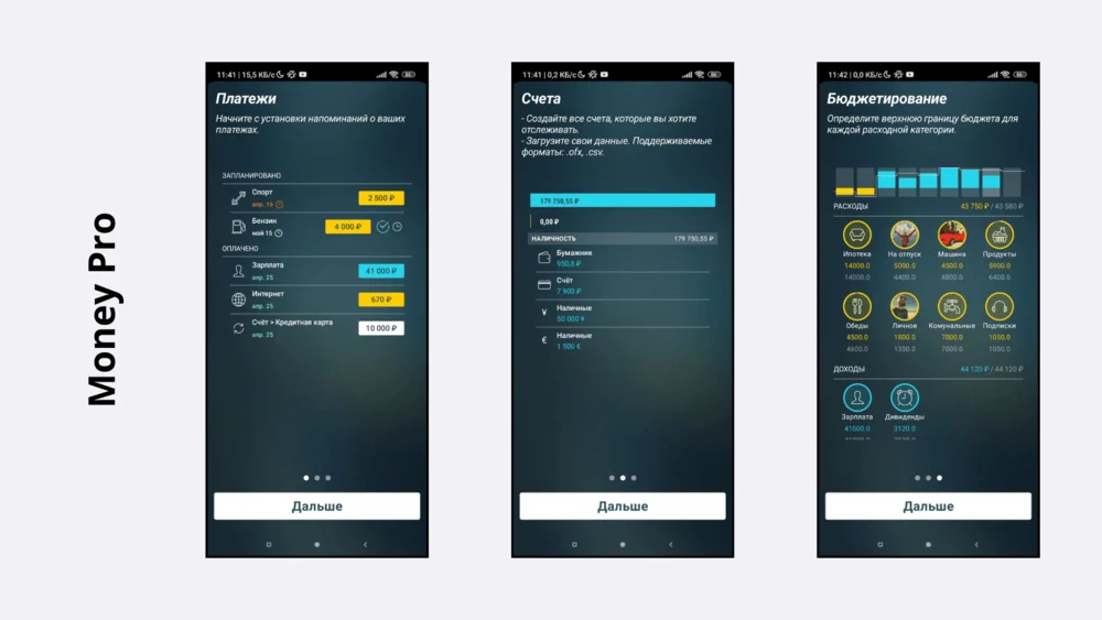 Удобной функцией Money Pro является то, что можно перенести остаток бюджета. Это увеличивает доступный лимит в следующем периоде. При этом можно управлять неограниченным количеством счетов.