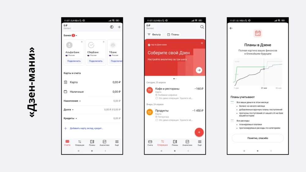 «Дзен-мани» сводит в единую картину платежи со всех карт и счетов и раскладывает их по категориям. Это избавляет от необходимости ручного учёта. А благодаря безопасной синхронизации можно загружать все данные из банков автоматически. Статистика расходов позволяет планировать обязательные платежи и отслеживать ненужные траты. Приложение синхронизируется со всеми крупнейшими банками России, Украины, Беларуси, Казахстана, Узбекистана, Азербайджана, Молдовы.