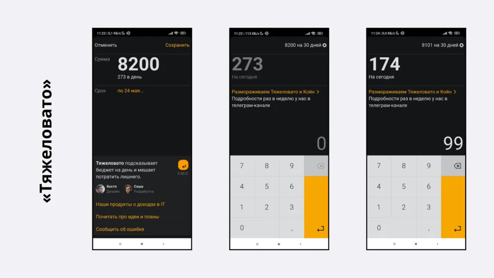 Стоит отметить, что «Тяжеловато» не подходит для детального учета. Однако оно помогает избегать лишних трат. Если потратить слишком много в один день, то на следующий день приложение покажет меньший бюджет.