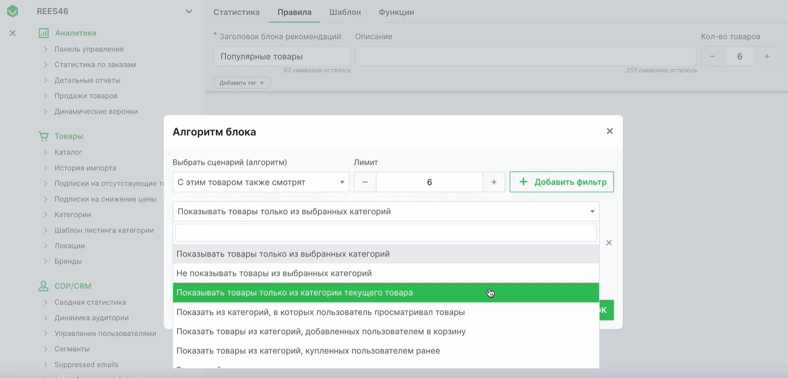 При настройке рекомендаций с помощью сервисов можно выбирать, какие именно виды товаров нужно показывать.