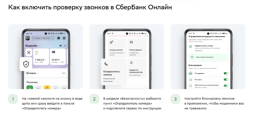 Это приложение блокирует не только номера спамеров по телефону, но и в мессенджерах. Все входящие анализирует искусственный интеллект и определяет подозрительные звонки в реальном времени. При необходимости пользователь может связаться с банком, чтобы получить помощь в случае разговора с мошенниками. Приложение работает только при включении соответствующей функции в мобильном банке.