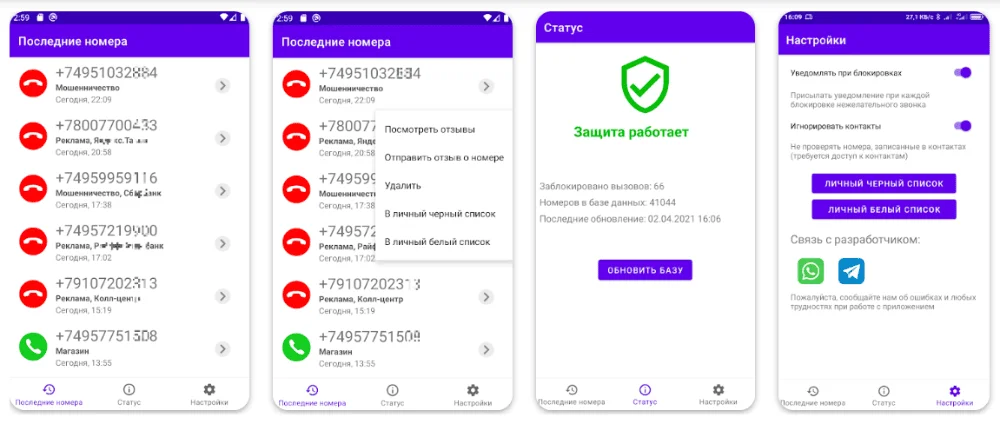 Truecaller имеет огромную базу, которая постоянно обновляется сообществом из миллионов пользователей по всему миру. Именно поэтому для работы сервис требует регистрацию и доступ к контактам, чтобы пополнять список спамеров. Приложение автоматически блокирует звонки и SMS от подозрительных абонентов. В бесплатной версии показывается реклама. На iOS функционал блокировки может быть ограничен политикой Apple.