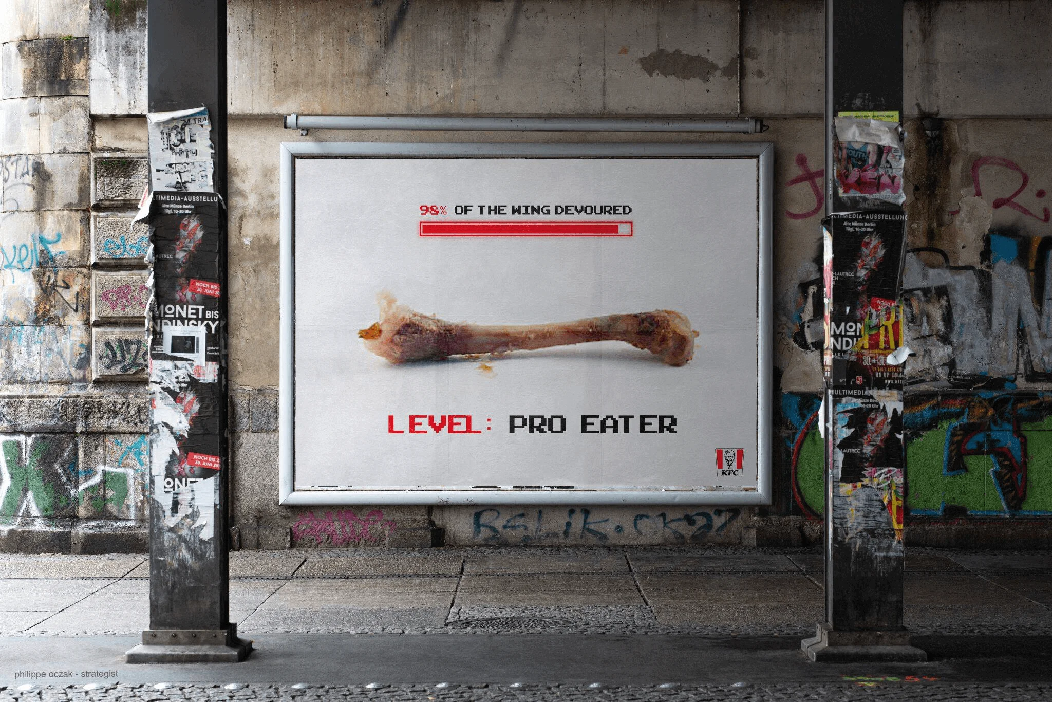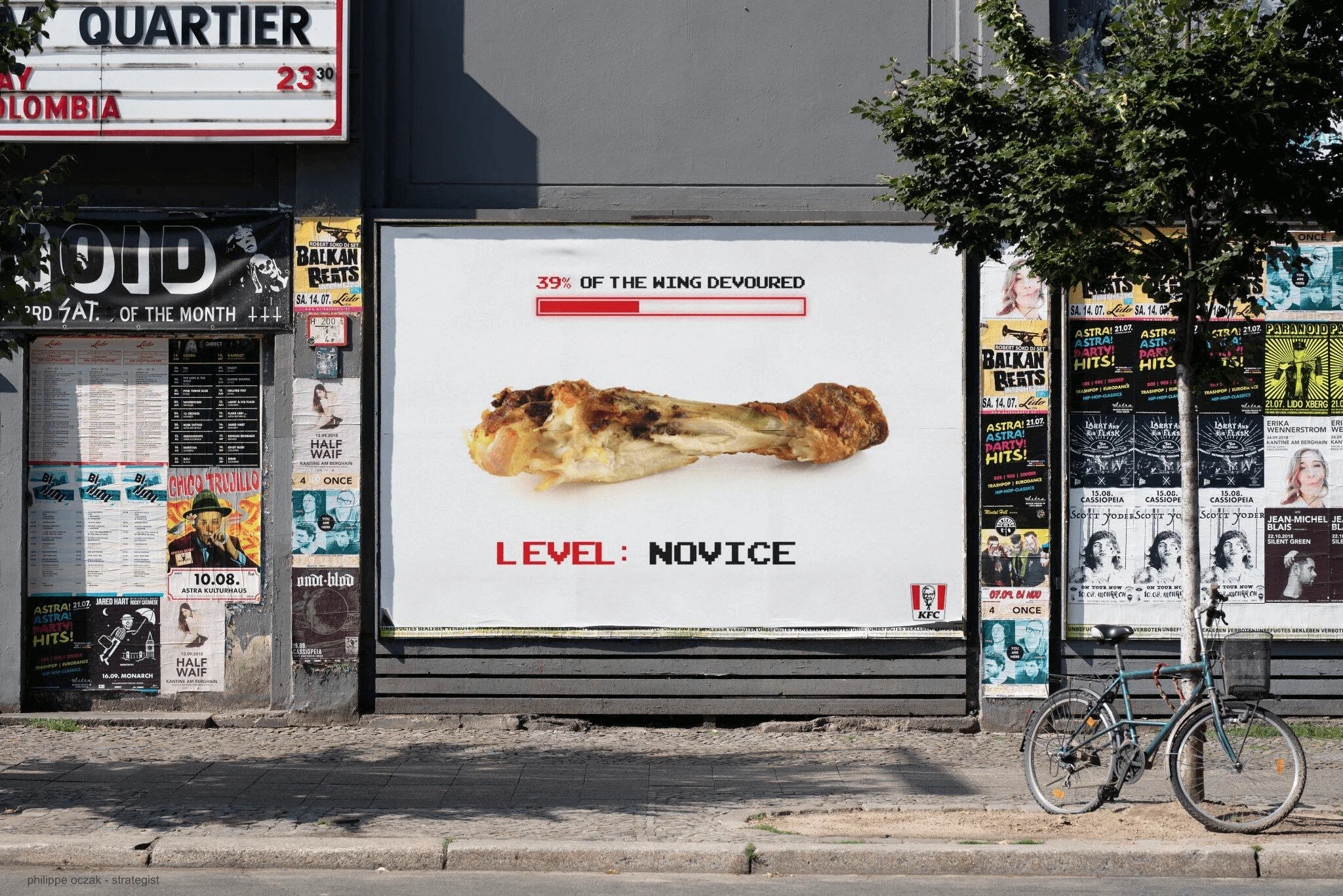 Для рекламной кампании KFC было создано два креатива со знаменитой курочкой. Создатели сфокусировались не на самом продукте, а на потребителе. Каков ваш уровень: новичок или профи? Начинающие оставляют мясо на кости, а профессионалы — поглощают до конца. Прогресс поедания на постерах обыгран как полоса загрузки видеоигры. Это графический элемент, близкий молодежной аудитории, на которую целилась кампания.