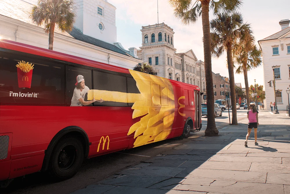 Прямо в окне автобуса — фото пассажира, который пробует картошку фри из McDonald’s. Такие креативы на транспорте привлекают внимание за счет диссонанса: с одной стороны, на них реалистичная картинка с пассажиром в окне, с другой — огромный продукт крупным планом.