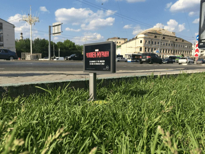 В России был разместили интересный мини-биллборд для рекламы фильма «Человек-Муравей». Сам билборд — чуть выше травы, и это отлично согласуется сюжетом фильма, где главный герой получает суперспособность уменьшаться до размера муравья.