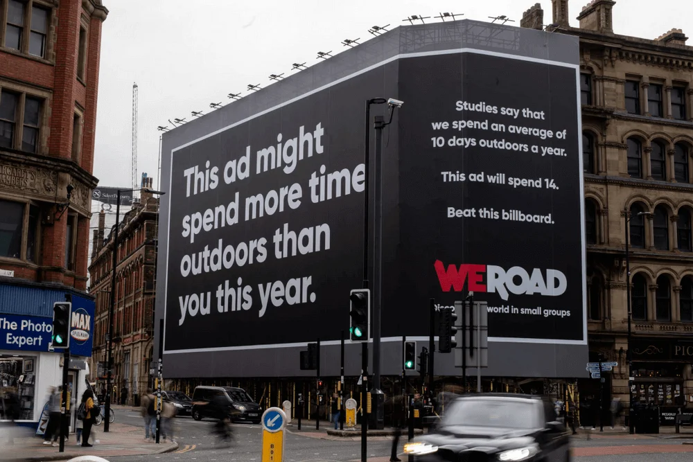 «Это объявление, вероятно, проведет больше времени на улице, чем ты за весь год» — гласит огромная надпись на улице Манчестера. По результатам исследований туристического агентства WeRoad, жители города в среднем проводят 10 полных дней на улице за год. Звучит пессимистично, зато компания рада предложить свои услуги по организации полезного досуга.