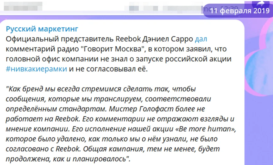 В 2019 Reebok в России запустил провокационную рекламную кампанию под названием «Ни в какие рамки». Бренд планировал ломать стереотипы вместе с сильными женщинами, но не все оценили такие смелые лозунги. На Reebok обрушилась волна негатива, и представители компании спешно удалили посты через несколько часов после публикации.