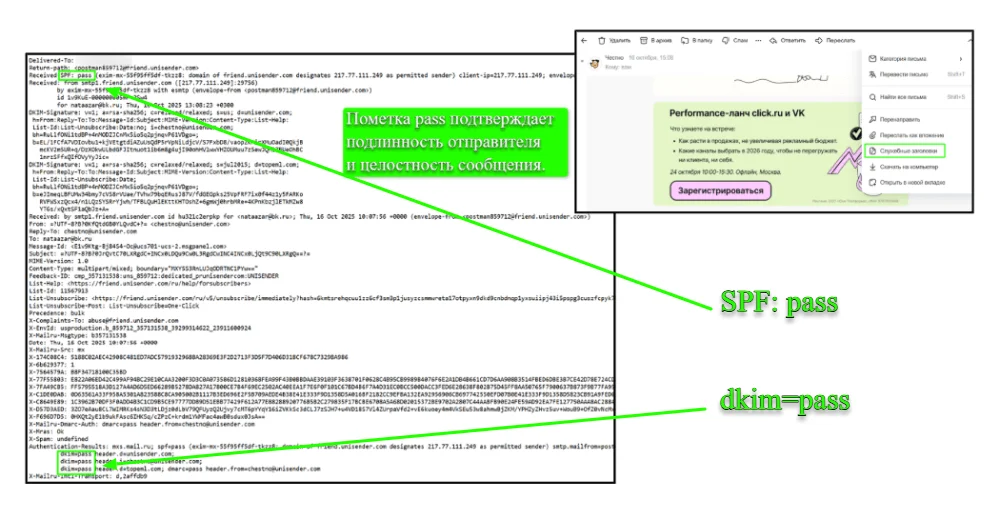 Для подтверждения подлинности письма в служебных заголовках вы должны увидеть статус SPF: pass (прошёл) и DKIM: pass (прошёл) или DKIM: OK.