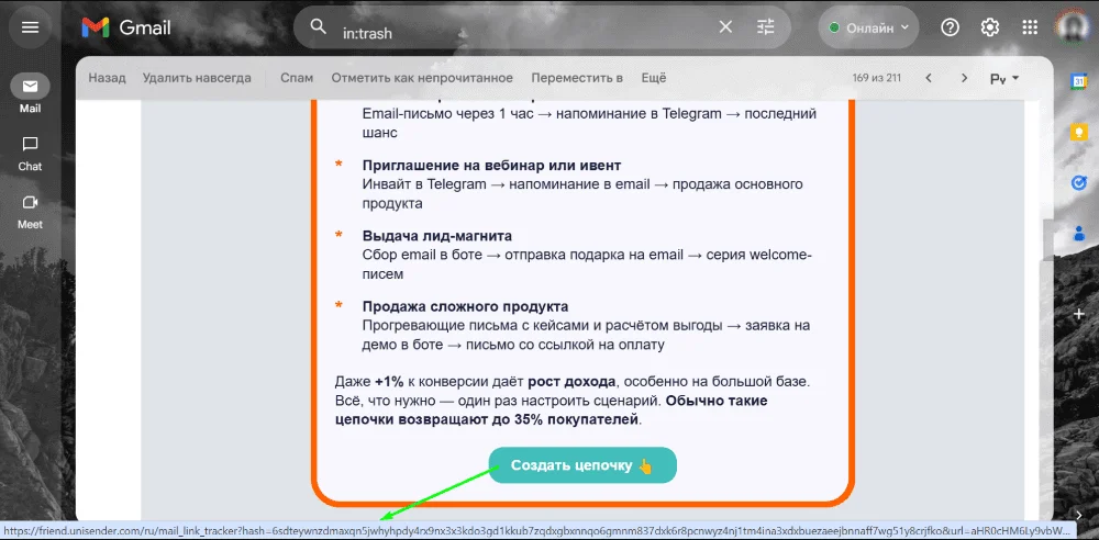 Если в подсказке вы видите очень длинный и непонятный адрес, не пытайтесь его расшифровать. Это может быть как легитимная ссылка для отслеживания кликов (трекинга), так и фишинговый URL. Чтобы проверить подлинность: