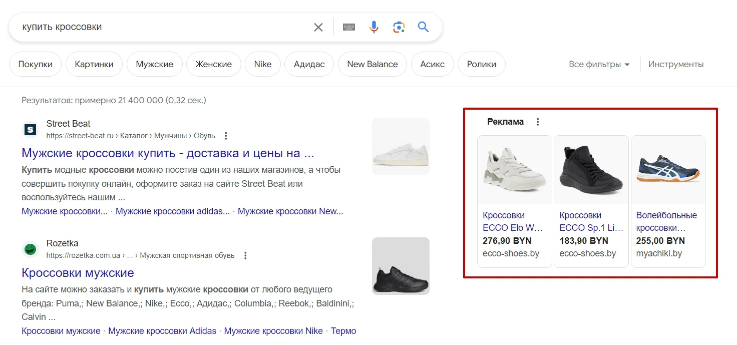 Работает она так: специалист подбирает ключевые слова, придумывает интересный заголовок и создает картинку с изображением товара. Если реклама показывается в поиске, то картинка не нужна. В итоге при вводе ключевых слов в поисковую строку, человек будет первым делом видеть рекламное объявление. Например, если человек ищет «купить кроссовки», ему покажут рекламу магазина с кроссовками.