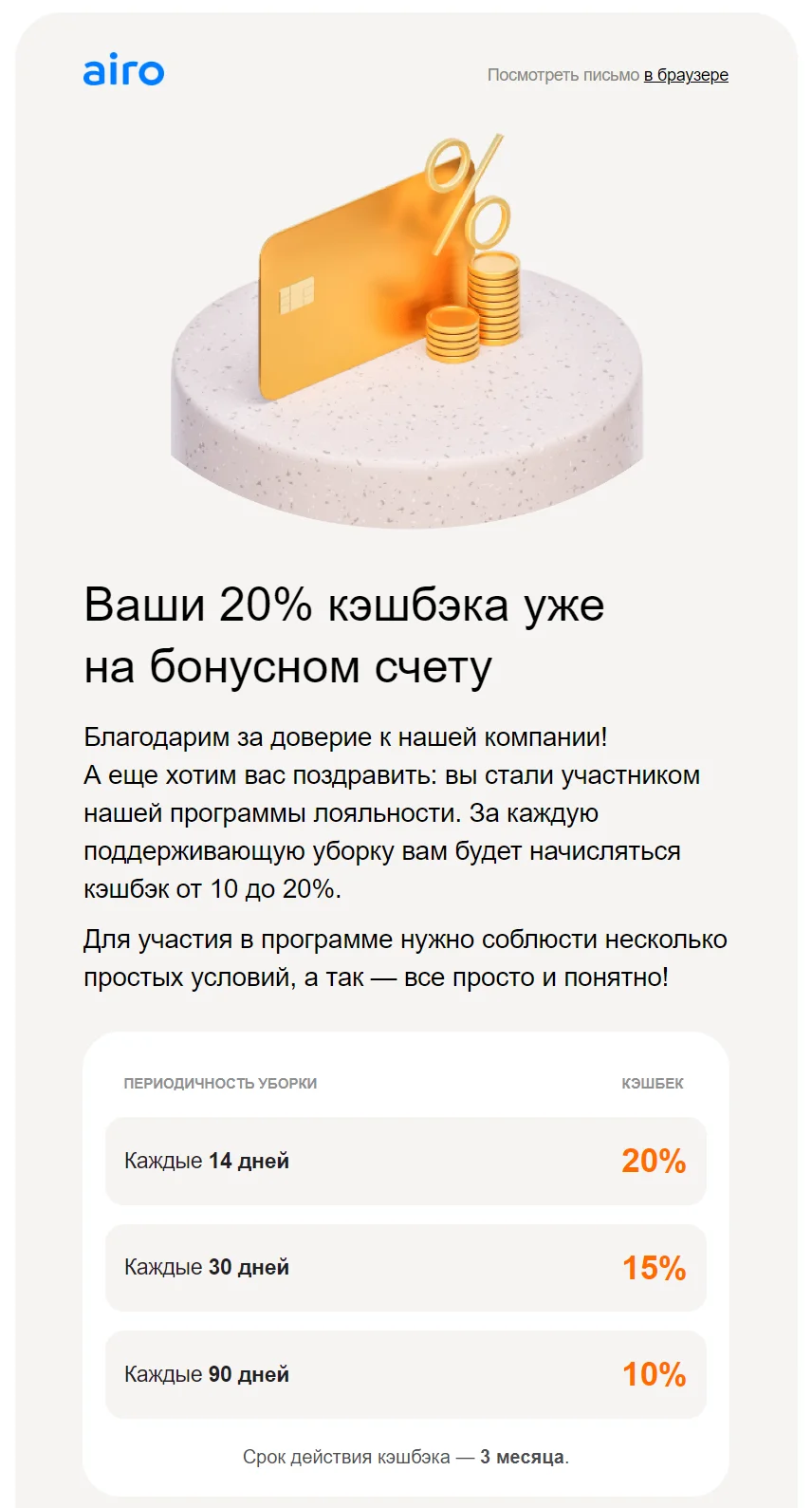 После заказа услуг по уборке клиент получает кэшбэк. Он начисляется в Airo-бонусах, которыми можно оплатить до 100% любой услуги в Airo в течение 3-х месяцев. Система начисления кэшбэка выглядит так: