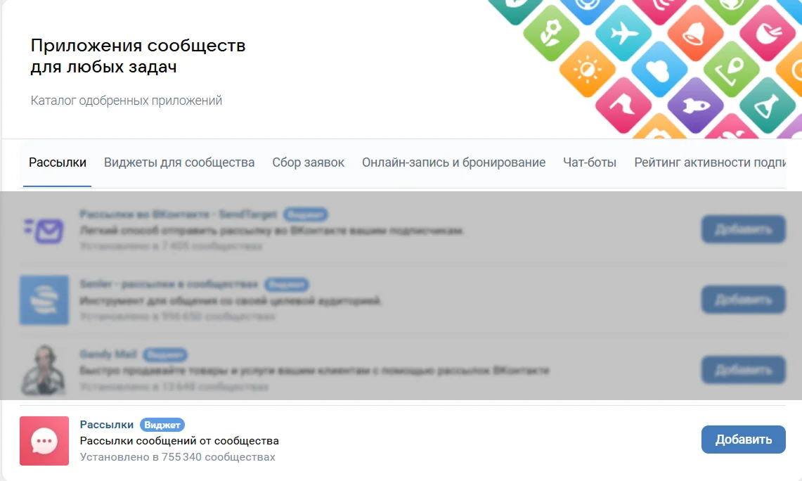Как подключить. В каталоге приложений ВКонтакте найдите «Рассылки» и нажмите кнопку «Добавить».