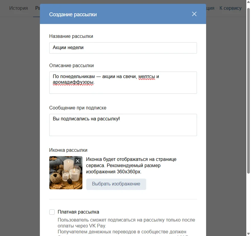 Когда добавите рассылки в группу, придумайте название канала рассылки и расскажите, о чём вы будете в ней рассказывать.