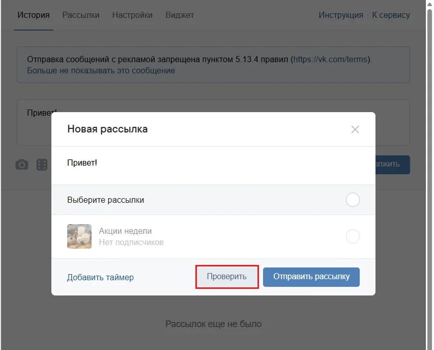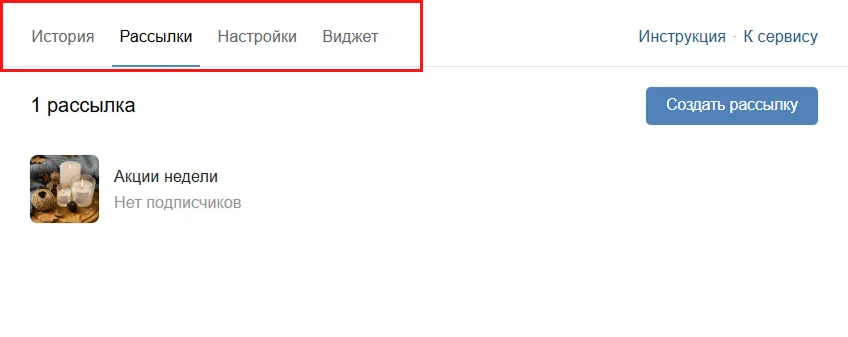 После этого на странице сообщества появится виджет сервиса — кликните на него, чтобы создать и настроить первую рассылку.