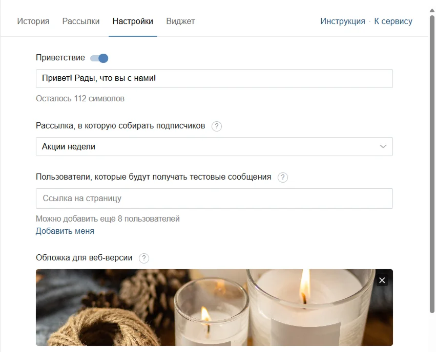 На вкладке «Настройки» можно написать приветственное сообщение до 140 символов, добавить обложку. Дополнительно можно выбрать до 8 получателей тестовой рассылки — это нужно, чтобы оценить, как получатели будут видеть сообщения. Для отправки тестовых сообщений рассылки себе нажмите на кнопку «Добавить меня».