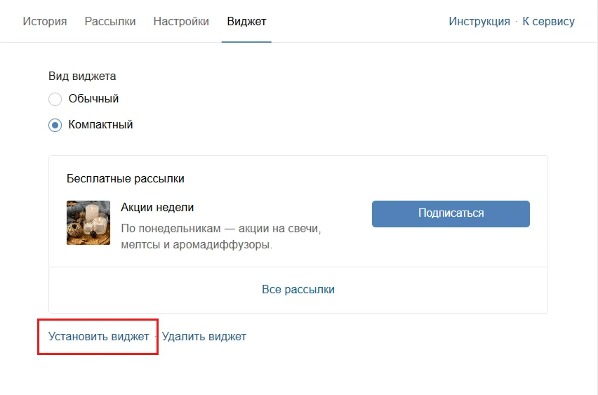 На вкладке «Виджет» можно добавлять и настраивать виджеты рассылок — они отображают конкретные рассылки на странице сообщества. Виджеты используют для привлечения внимания пользователей к важным для владельца рассылкам, в том числе платным.
