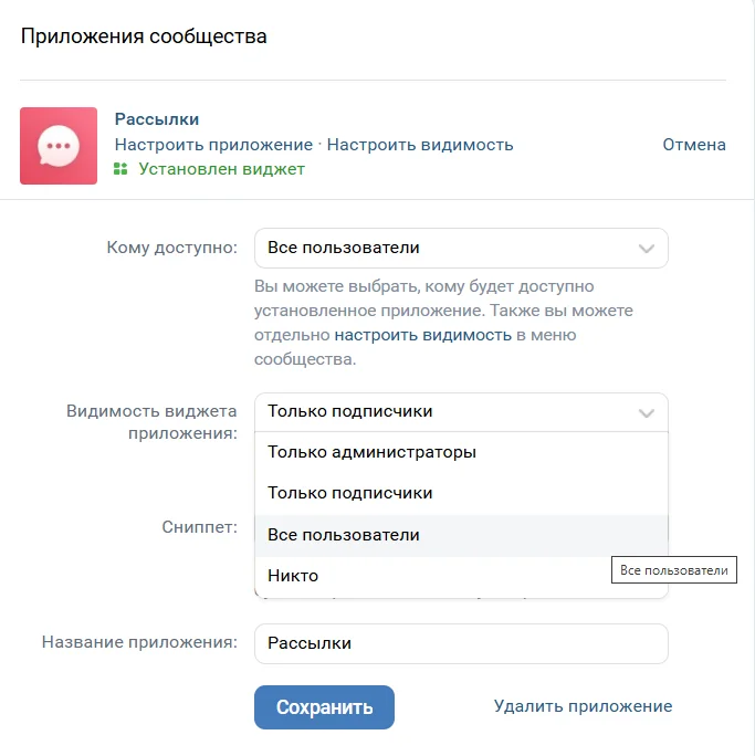После установки виджет появится на странице сообщества. По умолчанию после установки они видны только администраторам. Чтобы изменить видимость, нажмите «Управление» на странице сообщества, выберите вкладку «Приложения» и измените видимость виджета для всех людей. Так новые подписчики смогут подписаться на рассылку. Если хотите, можно сделать рассылку только для подписчиков канала.