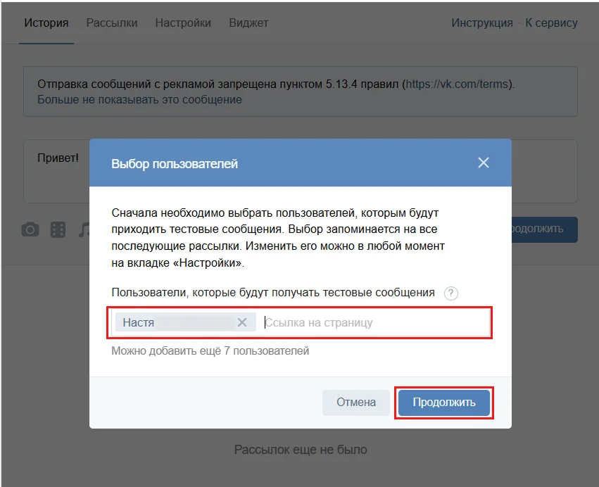 Важно! Правила социальных сетей запрещают массовые рассылки без предварительного согласия получателей. Прежде чем начать диалог, необходимо получить разрешение пользователя на отправку сообщений.