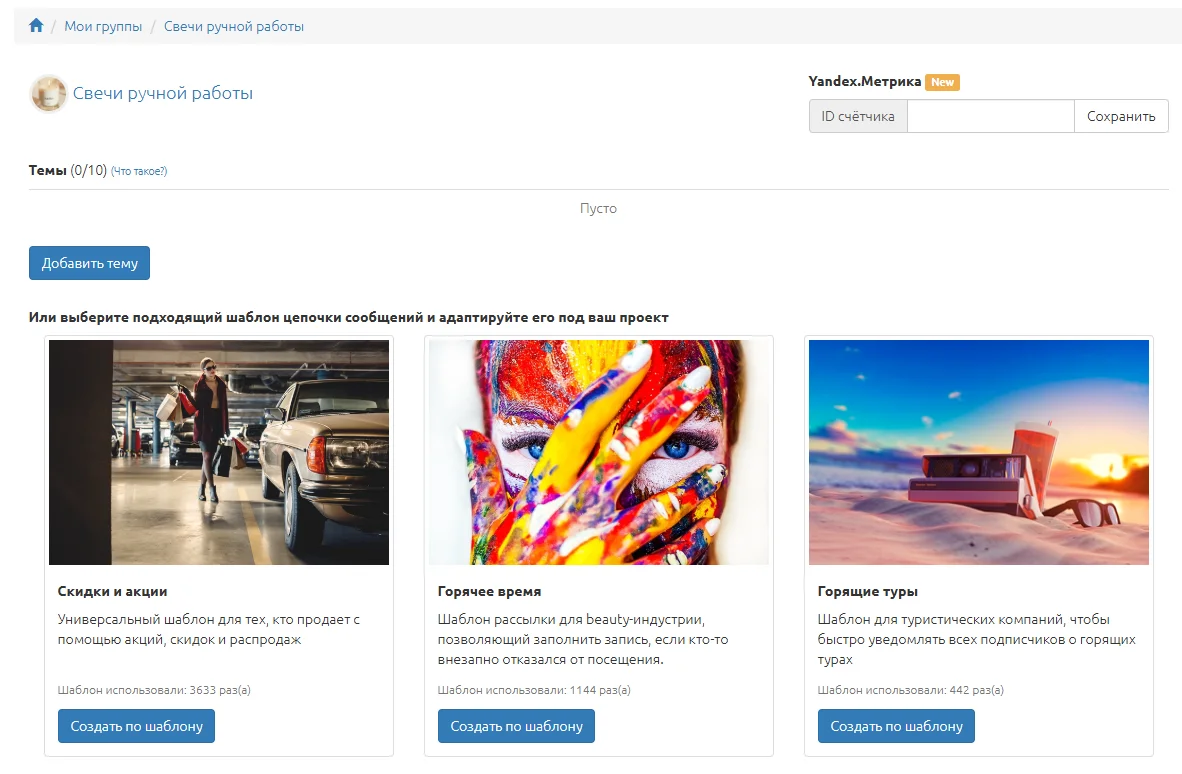 Подключите сообщество к сервису через главную страницу сайта. Перед созданием первой рассылки задайте ее тему или выберите подходящий шаблон.
