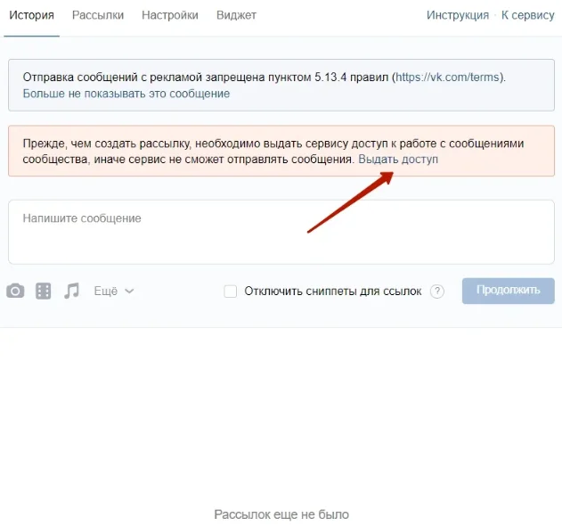 На вкладке приложения «История» необходимо выдать доступ, чтобы сервис мог рассылать подписчикам сообщения.