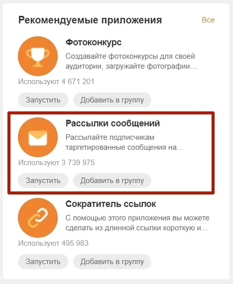 В Одноклассниках также есть собственное приложение для отправки рассылок от имени группы.