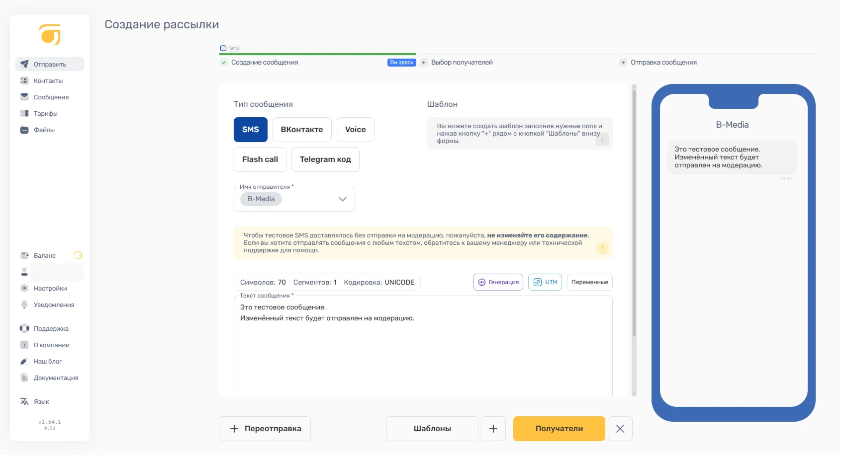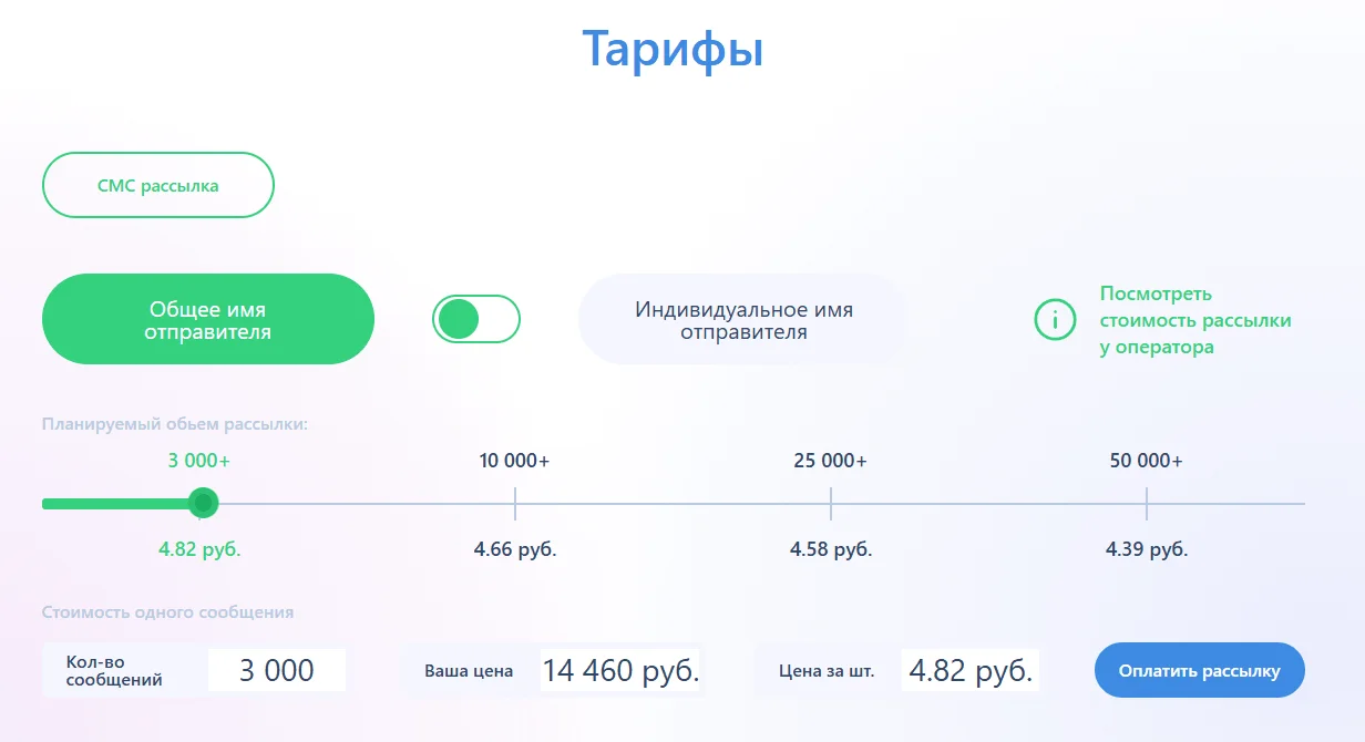 Цена. Стоимость одного сообщения — от 4,82 ₽ за 3000 сообщений. Далее цена за сообщение снижается в зависимости от объема. Оплачиваются только доставленные сообщения.