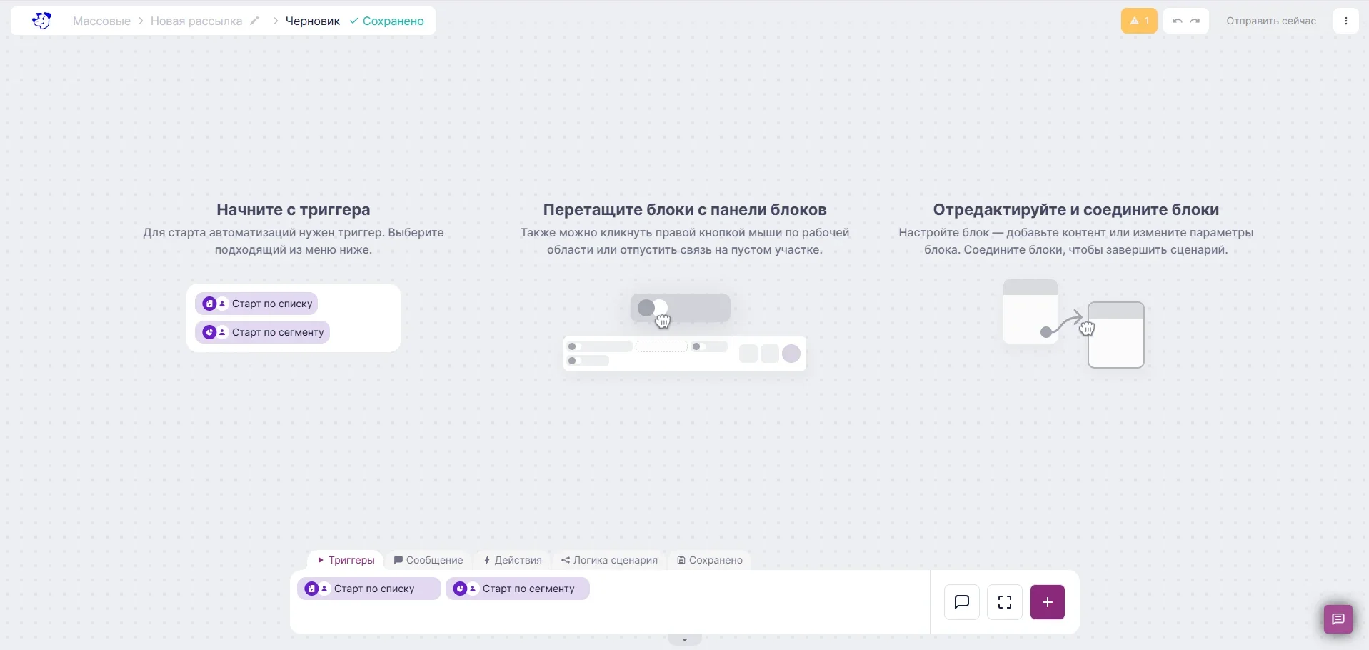 Unisender — конструктор чат-ботов под любые задачи. При создании бота с нуля вы составляете сценарий в удобном редакторе: готовые блоки можно расставлять по своему усмотрению простым перетаскиванием, менять порядок, добавлять свой контент, задавать интервал задержки ответов.