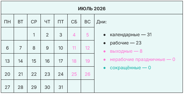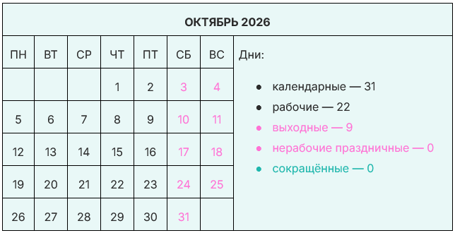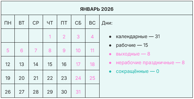 В 2026 году в целом при пятидневной неделе с двумя выходными днями будет 247 рабочих дней, в том числе 4 дня сокращенных на один час и 118 выходных и нерабочих праздничных дней. Следовательно, норма рабочего времени в 2026 году в целом выглядит следующим образом: