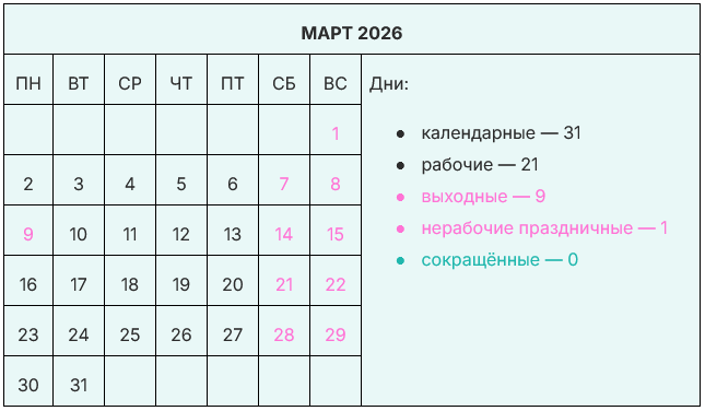 Совет для руководителей и специалистов по финансовому планированию. В марте особенно важен контроль бюджета при переработках. Праздник 8 Марта с длинным уикендом делает сверхурочную работу особенно дорогой. Требуется строгое соблюдение и учёт рабочего времени.