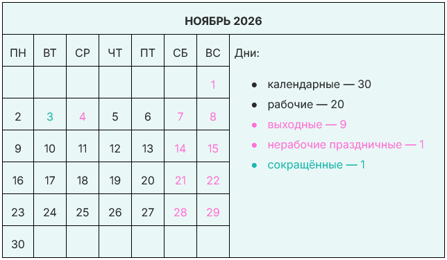 Совет для руководителей и специалистов по финансовому планированию. В ноябре — всё стандартно. Однако важно не забыть про сокращённый день 3 ноября. Если сотрудники отработают его полностью, то компания будет обязана компенсировать этот час как сверхурочный. Это может привести к незапланированным затратам.