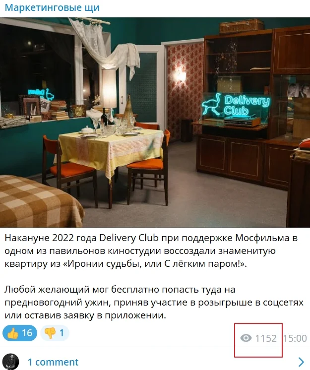 В отличие от соцсетей, Telegram отдает мало статистики, поэтому цифры рядом с значком «глаза» — основной показатель активности аудитории и эффективности контента.