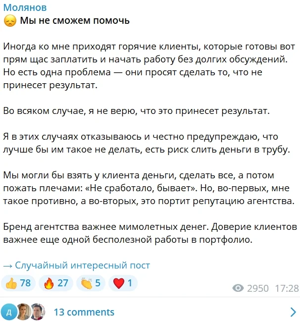 Упрощают поиск рекламодателей. При покупке рекламы учитывают не только количество подписчиков, но и охват аудитории — в Telegram он измеряется теми самыми просмотрами. Когда их достаточно, рекламодатель понимает, что аудитория реальная и активная, а значит может заинтересоваться предложением. Каналу с вовлеченными подписчиками проще находить рекламодателей.