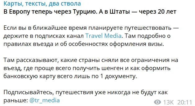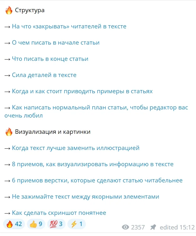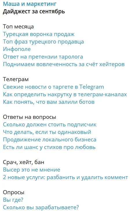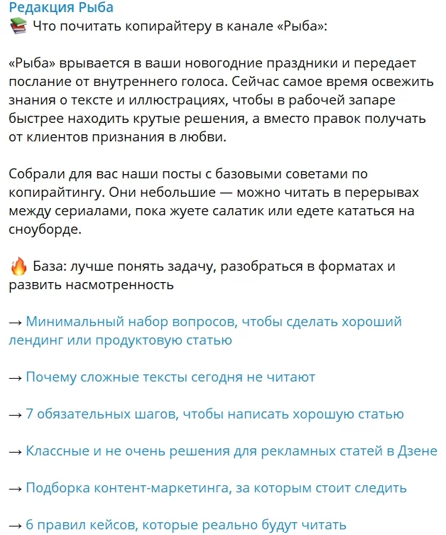 В идеале подписчики интересуются содержимым такого поста и переходят по ссылке, а канал получает новые просмотры. Кстати, как вариант давать ссылку не на канал, а на определенный пост — так человек не растеряется перед выбором, а посмотрит хотя бы эту (уже отобранную для него) публикацию.