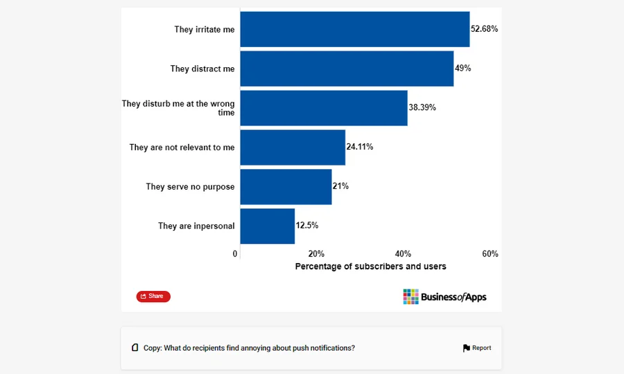 Время отправки. 49% пользователей терпеть не могут, когда пуши их отвлекают от работы, 38% — когда уведомления приходят в неподходящее время.