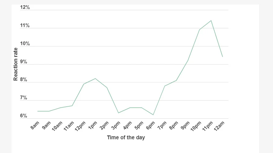 Согласно маркетинговым исследованиям, показатель reaction rate растет, начиная с 20:00 — рабочий день окончен, дорога домой уже позади. Самый высокий показатель reaction rate в 11% приходится на 23:00 вечера. Небольшой всплеск внимания (до 8,2%) наблюдается во время обеденного перерыва, обычно с 12 до 14 часов дня.