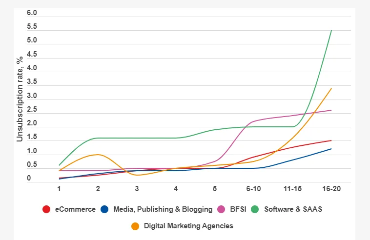 Как видно по кривой соотношения количества пушей с количеством отписок, менее всего пользователи готовы получать частые уведомления от разработчиков ПО/SaaS. Им даже два раза в неделю — слишком часто.
