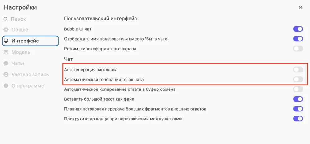 В настройках в разделе «Интерфейс» можно отключить автоматическую генерацию тегов и названий. Тогда каждый диалог будет называться первыми словами промпта.