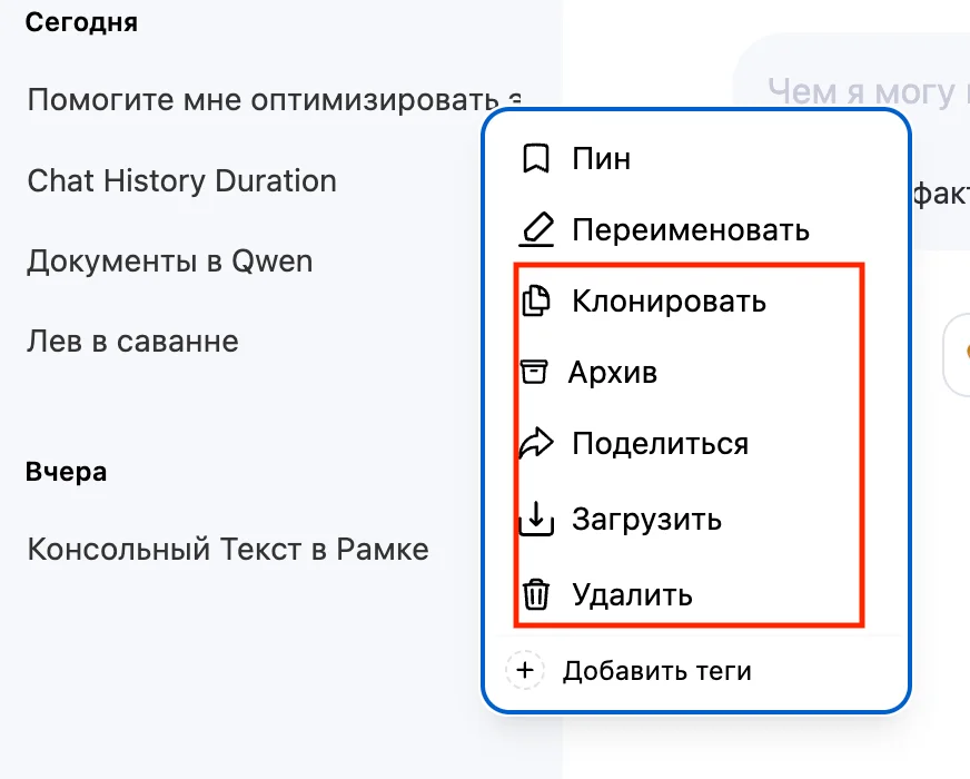 Теги Qwen тоже распределяет сам. Чтобы добавить тег, нажмите «+», а для удаления — крестик. Важные чаты стоит закрепить по кнопке «Пин». Открепляются диалоги таким же способом.