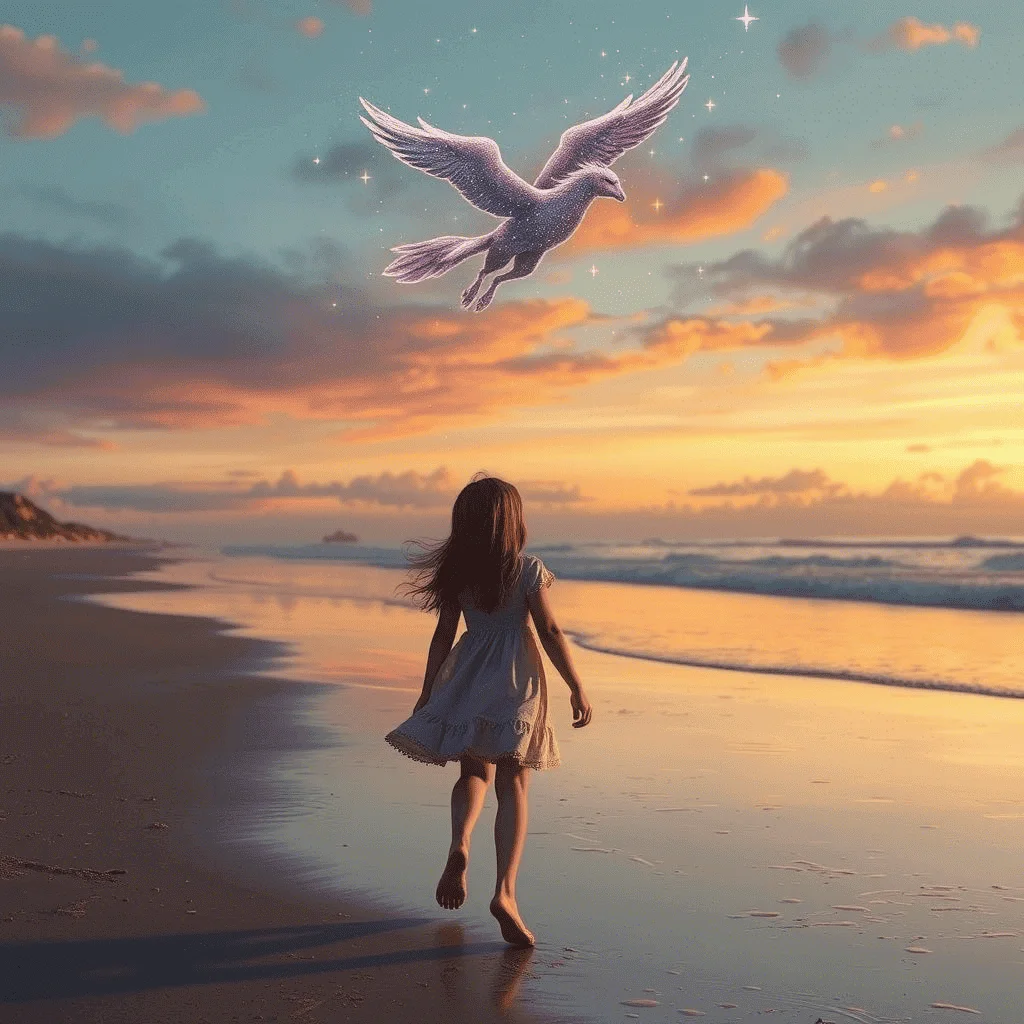 Переключитесь на нужный режим и введите свой запрос. Не нужно начинать промпт со слов «Нарисуй» или «Покажи». Генерация занимает до минуты, в зависимости от сложности запроса. Язык влияет только на скорость — если написать по-английски, ИИ сделает картинку быстрее. Со сложными запросами Qwen справляется не всегда. Например, мы использовали промпт: «Девочка гуляет по пляжу на закате. В небе она видит очертания пегаса из звезд. Стиль реализм».