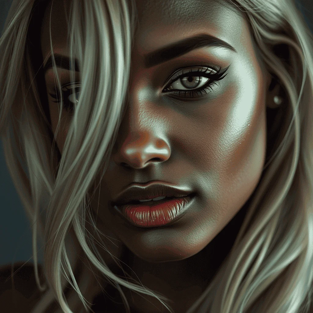Промпт: «Женщина со светлыми волосами и темной кожей. Портрет. Макияж в сказочном стиле. Блестящие тени, хайлайтер на щеках и губах. Мягкий свет. Фотореализм».