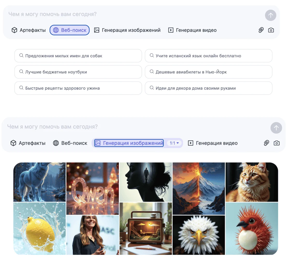 Если уже пользовались ChatGPT, DeepSeek или Claude, то возможности Qwen не удивят. Нейросеть генерирует тексты, пишет код, создает изображения, анализирует файлы и работает как браузер.