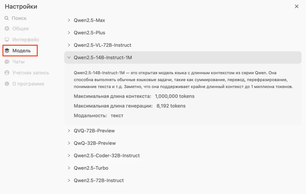 Подробнее о доступных моделях можно почитать в настройках в одноименном разделе.