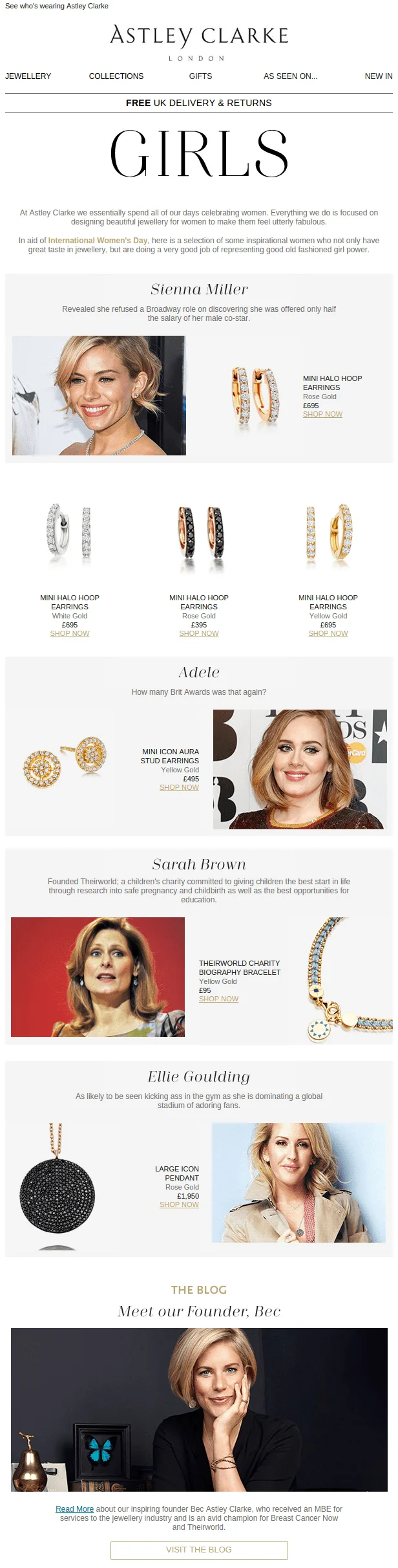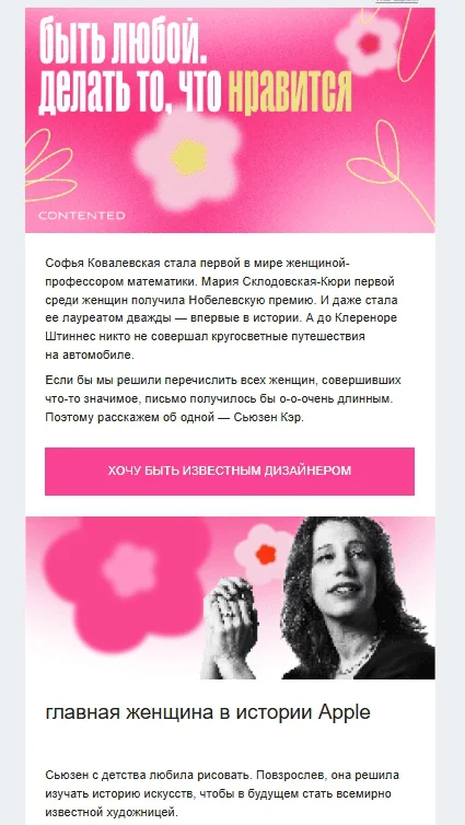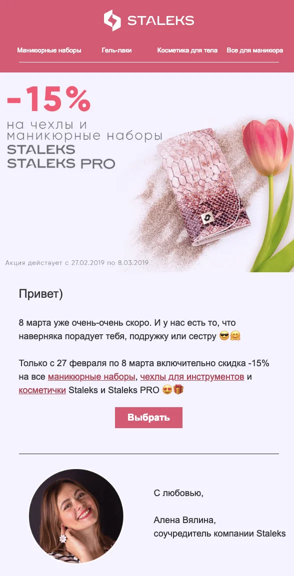- Следующий пункт вытекает из предыдущего: отправить рассылку с одним только поздравлением можно, но при условии, что у вас есть история взаимоотношений и прямой коммуникации с получательницей. Например, такую рассылку можно сделать, если вы работаете в секторе B2B и регулярно общаетесь с конкретным менеджером по персоналу.