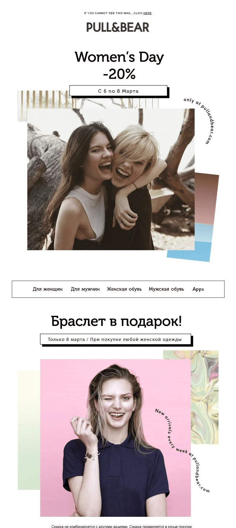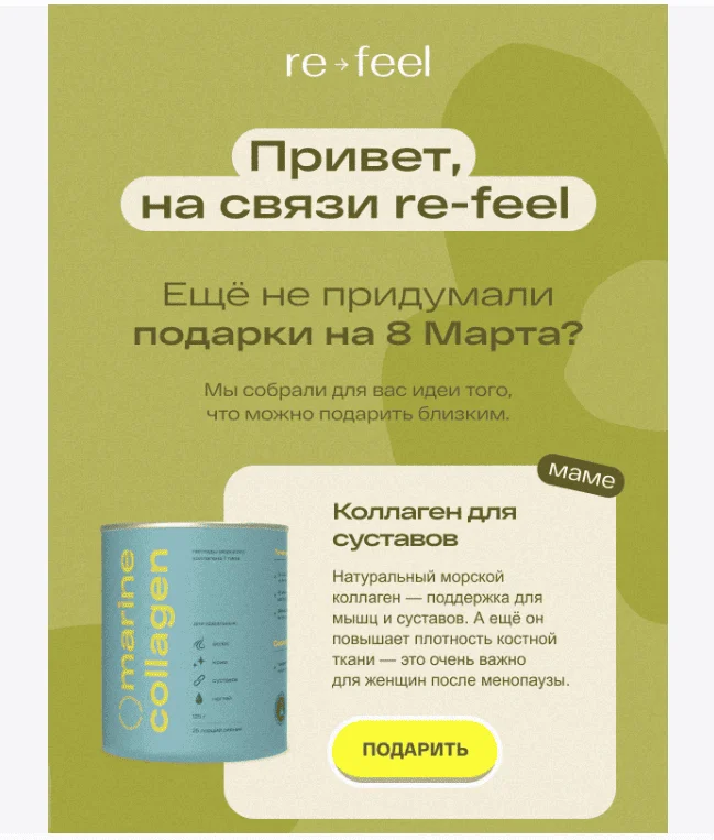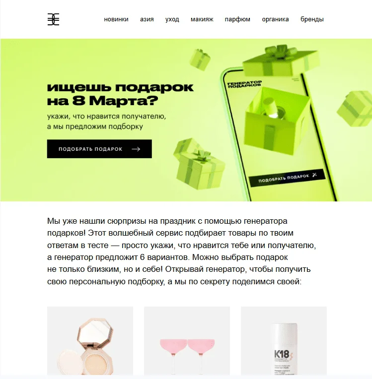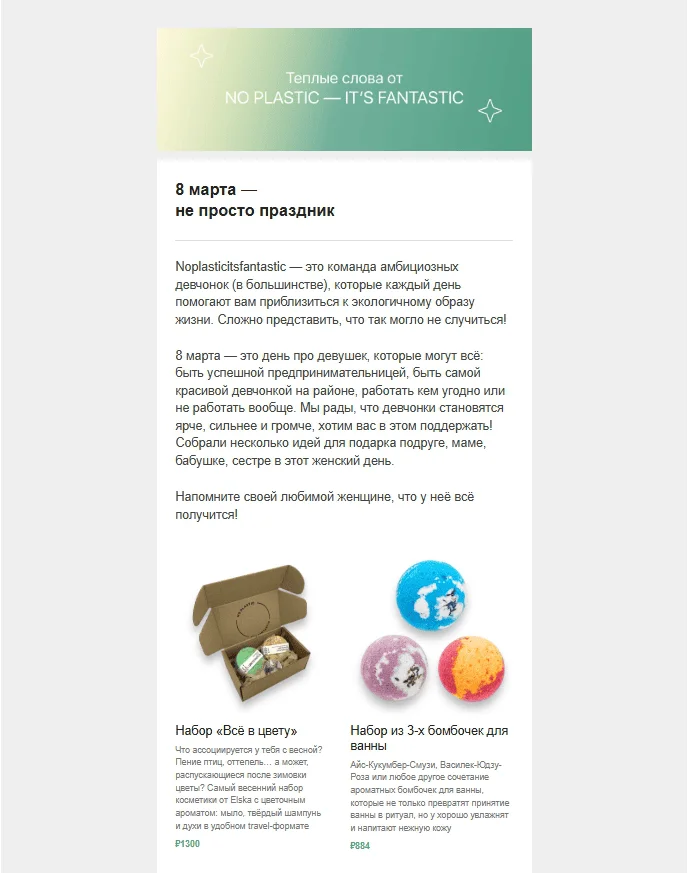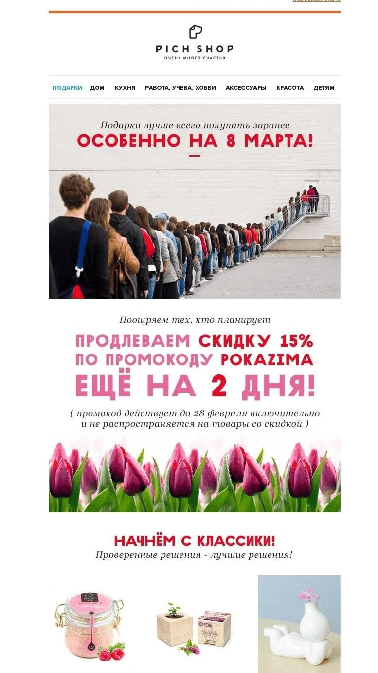 Вывод здесь простой: вместо «голых» поздравлений женщинам стоит предлагать продукт в качестве подарка — так же, как и мужчинам. Однако подача и типы подарков в этом случае будут отличаться — поэтому и стоит делать разные письма. Ну и, конечно, поздравительную часть лучше включать в рассылку только для женской аудитории.