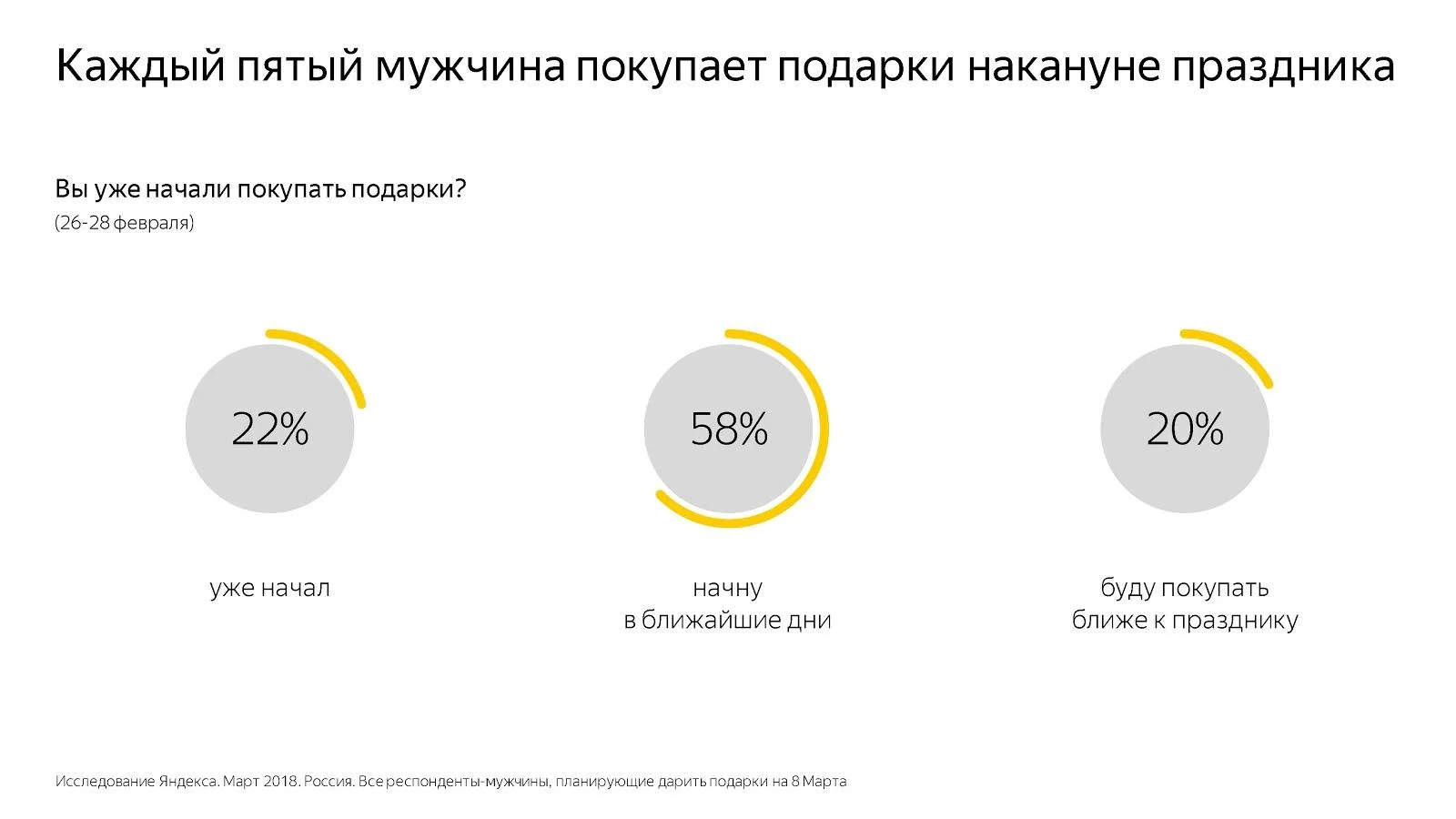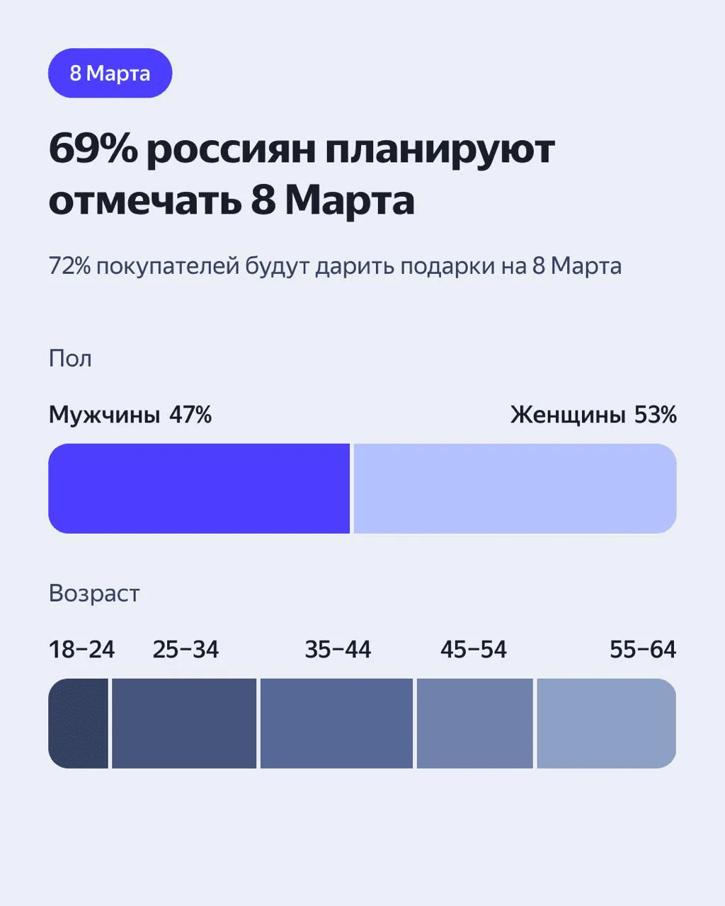 «Яндекс Реклама» предлагает другую статистику. По их данным на начало 2025 года, женщины вообще чаще покупают подарки на 8 марта.