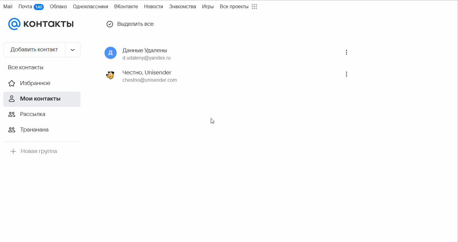 Здесь сценарий не меняется: добавляем контакты, создаем группу, отправляем письмо. Поэтому сначала нужно нажать на «контакты» → «добавить контакт (вручную) » или «импорт и экспорт (в формате vCard)».